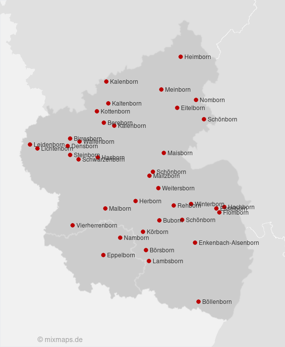 Karte Rheinland-Pfalz und Saarland: Städte und Gemeinden, die auf ...born enden
